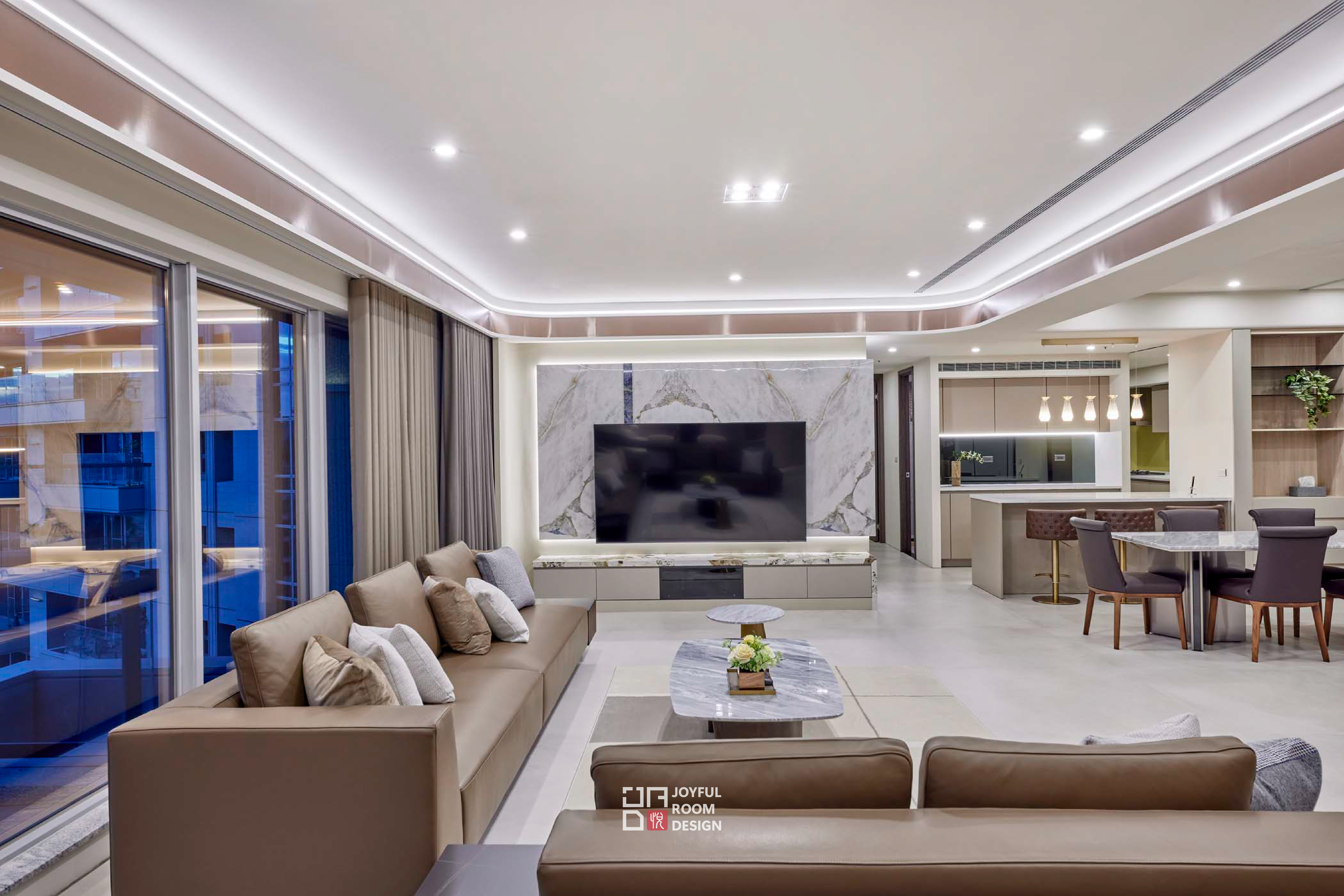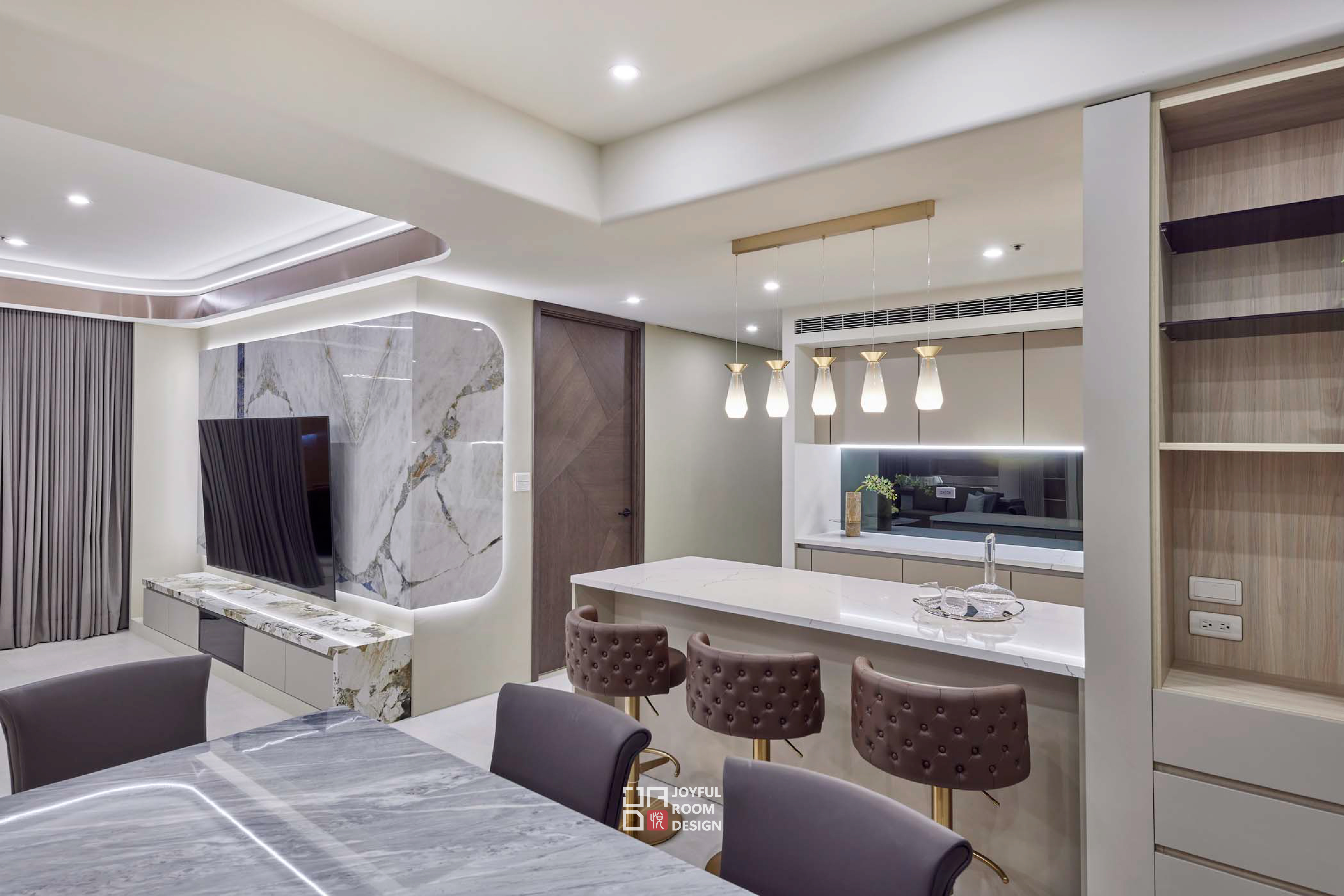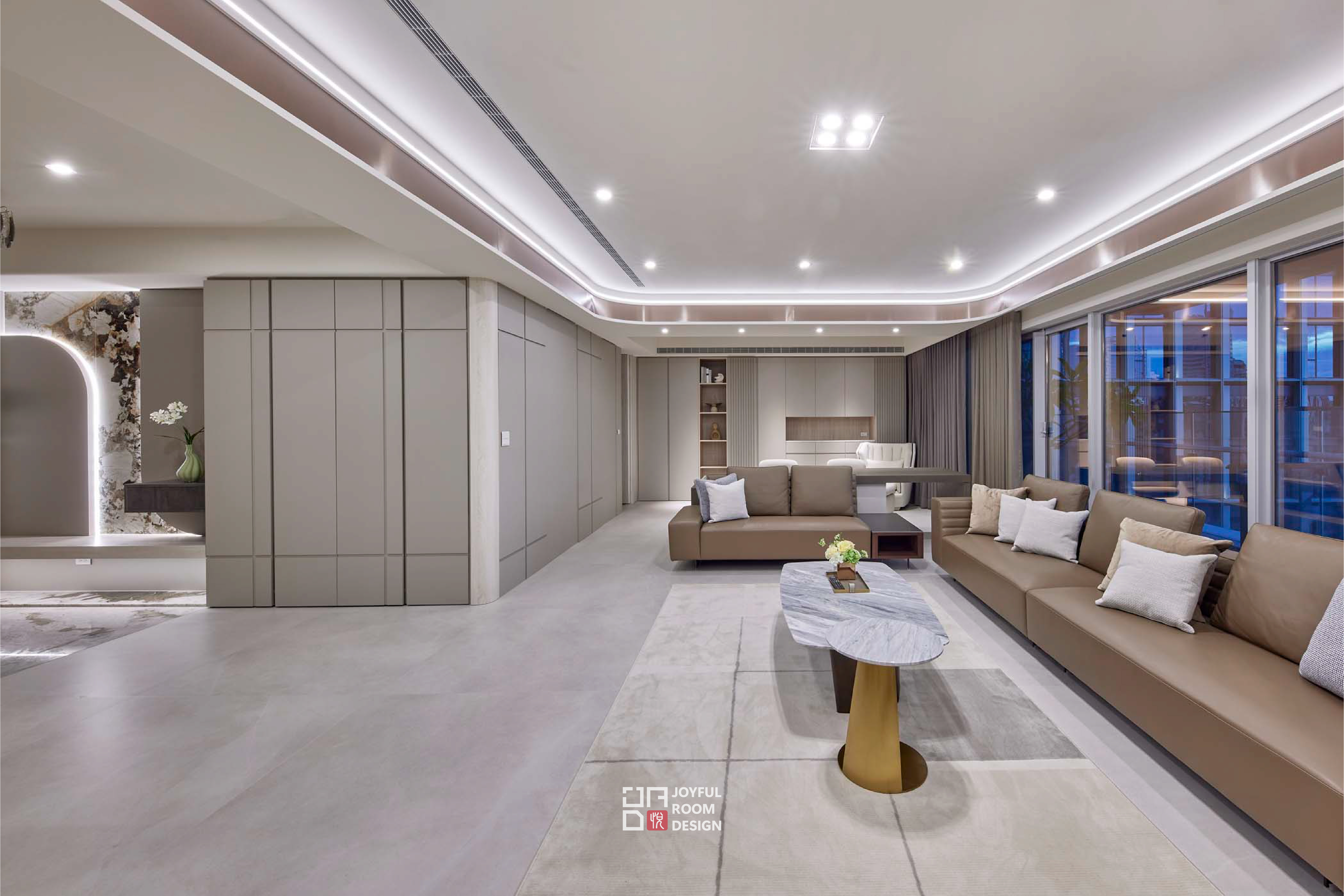 本案設計以舒適、寬敞與穩定為主軸,為年長成員打造一處靜謐的生活場域。設計師觀察使用者習慣,拉寬公共區域尺度,保留整面落地窗引入自然景致,使空間如容器般包容日常節奏與戶外光線