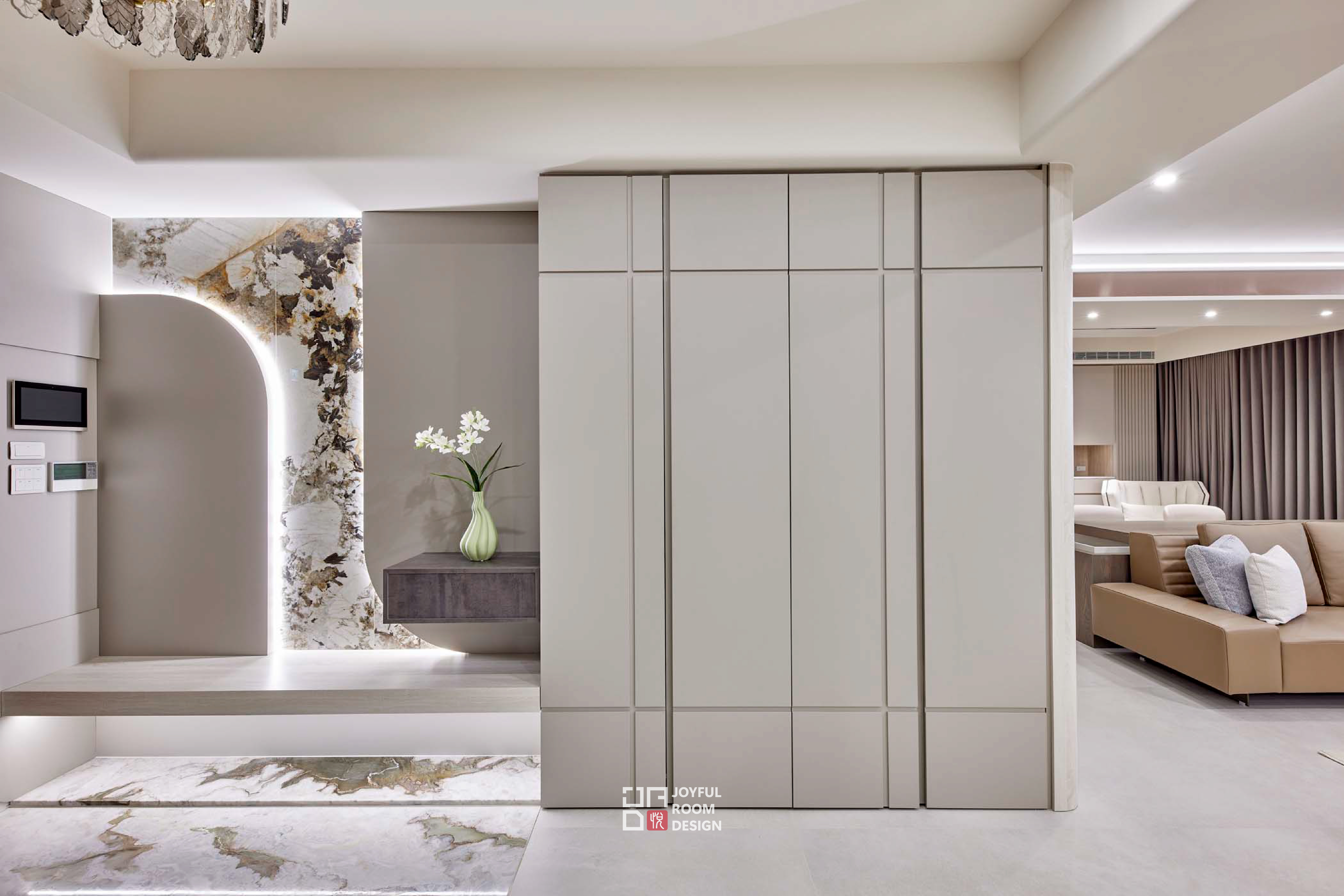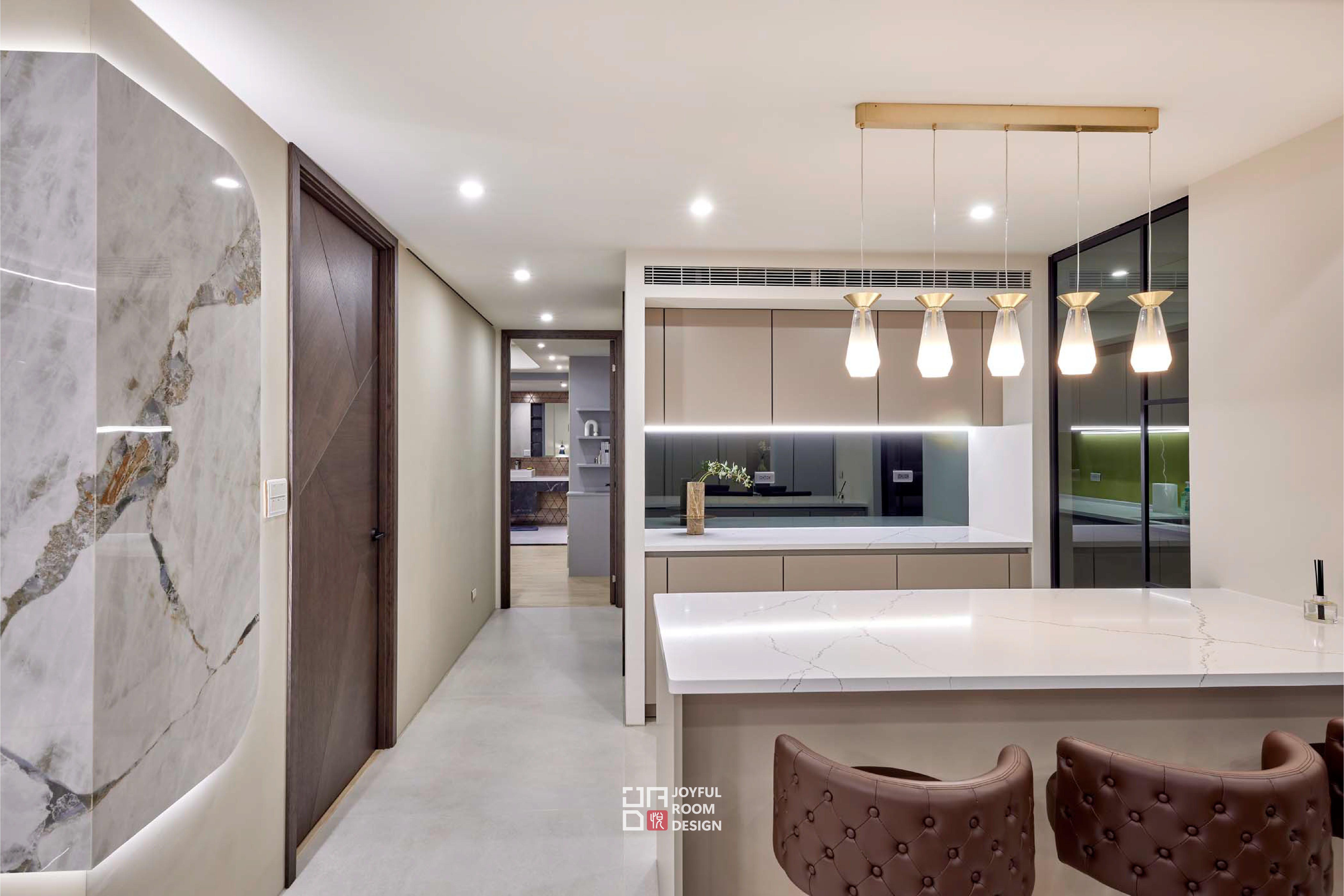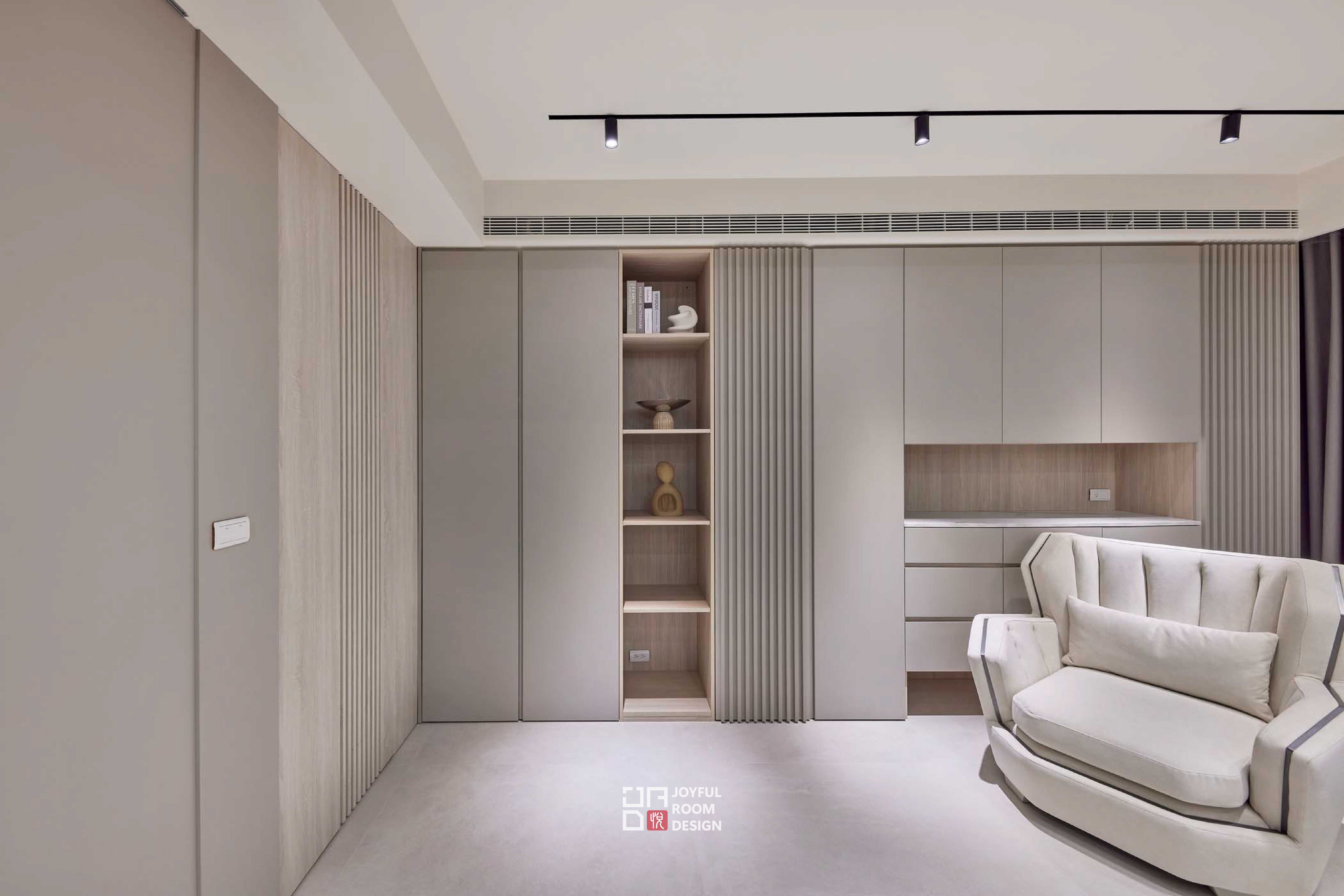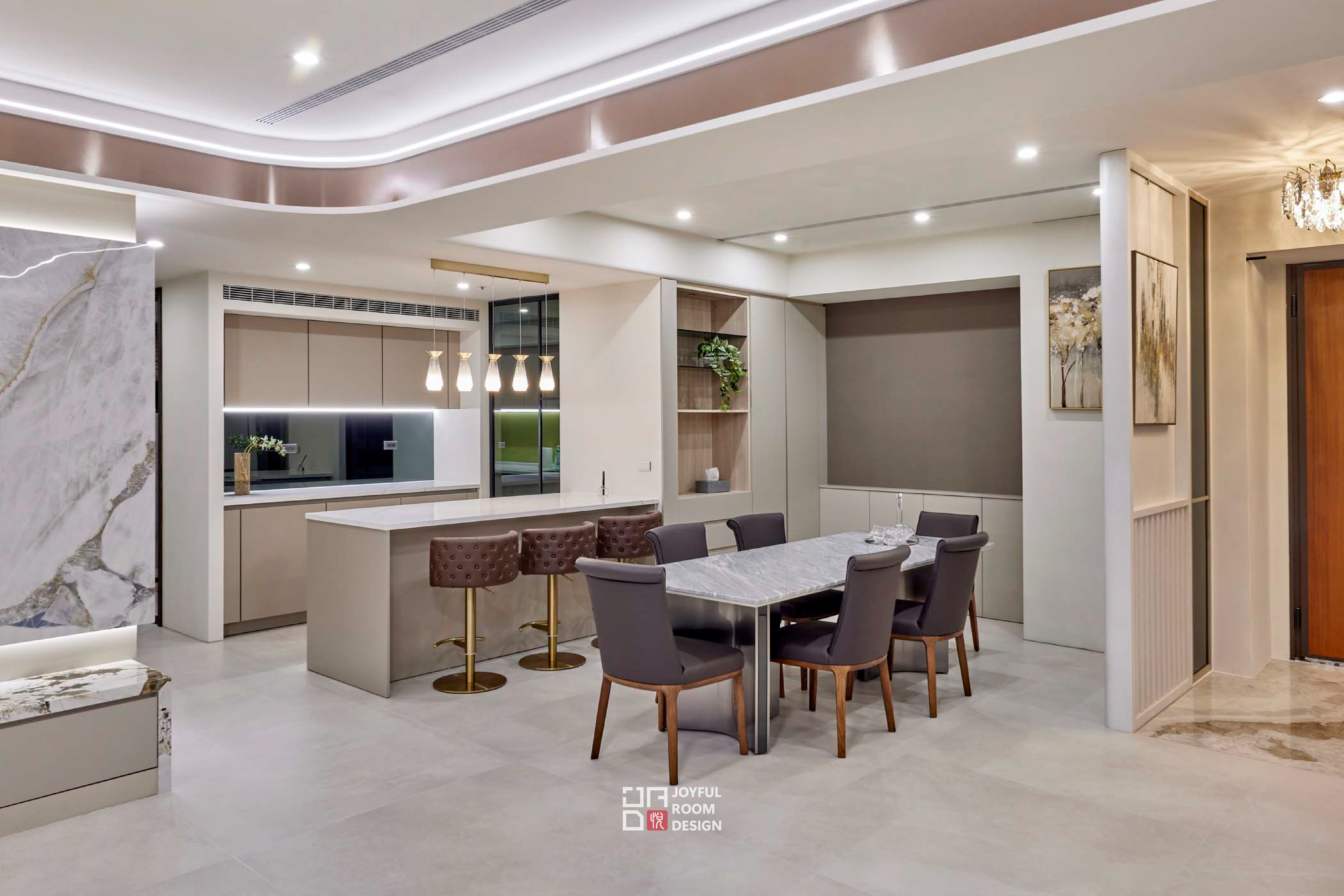 本案設計以舒適、寬敞與穩定為主軸,為年長成員打造一處靜謐的生活場域。設計師觀察使用者習慣,拉寬公共區域尺度,保留整面落地窗引入自然景致,使空間如容器般包容日常節奏與戶外光線